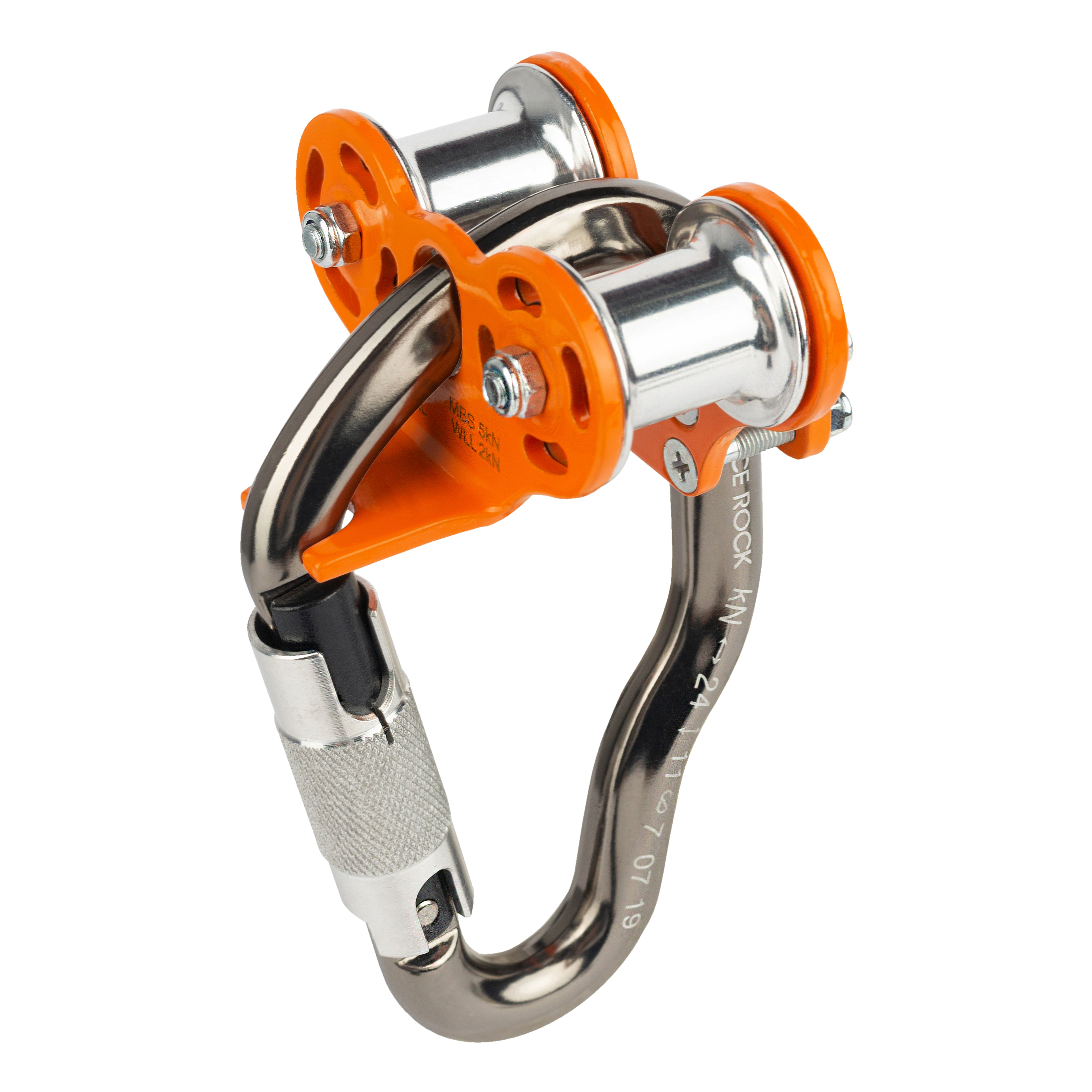 Конструкция изделия позволяет даже при разрушении ролика верёвке(или стропе) остаться в карабине.