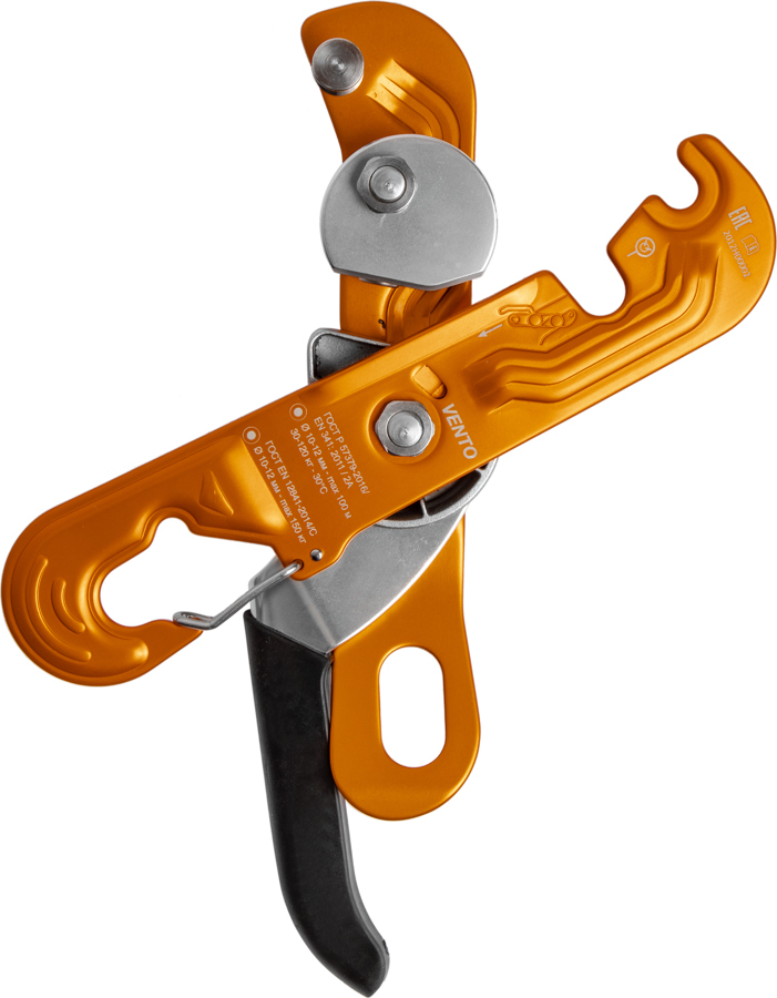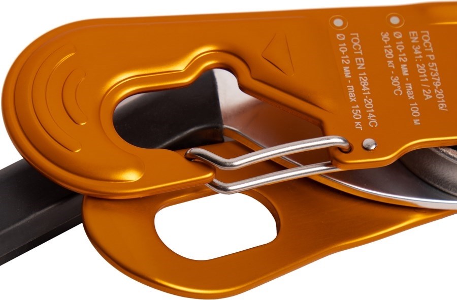 Устройство для спуска и позиционирования на канатах. Подходит для спусков в безопорном пространстве. «Стопор-десантер» может применяться в качестве второго фиксирующего устройства при непродолжительном подъеме по веревке совместно с жумаром и стременем.Стопор присоединяется к привязи через карабин. При этом веревка устанавливается и вынимается из устройства без необходимости его снимания с привязи. Подвижная пластина устройства имеет открывающуюся скобу для фиксации на карабине. Канат закладывается в одной плоскости, что гарантирует минимальное скручивание веревки при длительных спусках. Рекомендуется использовать на канатах Ø 10-12 мм «Высота» и «Профистатик» ТМ VENTO (ГОСТ EN 1891/А).